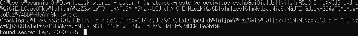 10000000~99999999사이의 숫자가 담긴 테이블을 먼저 만든 뒤 온라인에 공개되있는 jwt crack 툴을 이용하여 key값을 구했다.