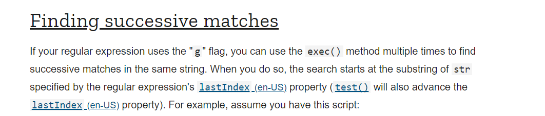 뭔가를 찾은 것 같다. 저부분을 해석해보면 global flag를 RegExp에서 사용하는 경우 exec나 test 메소드를 이용하여 여러번 동일한 문자에서 다음에 나타나는 일치하는 문자열을 찾을 수 있도록 lastindex 속성을 생성해준다고 한다.